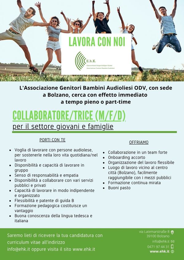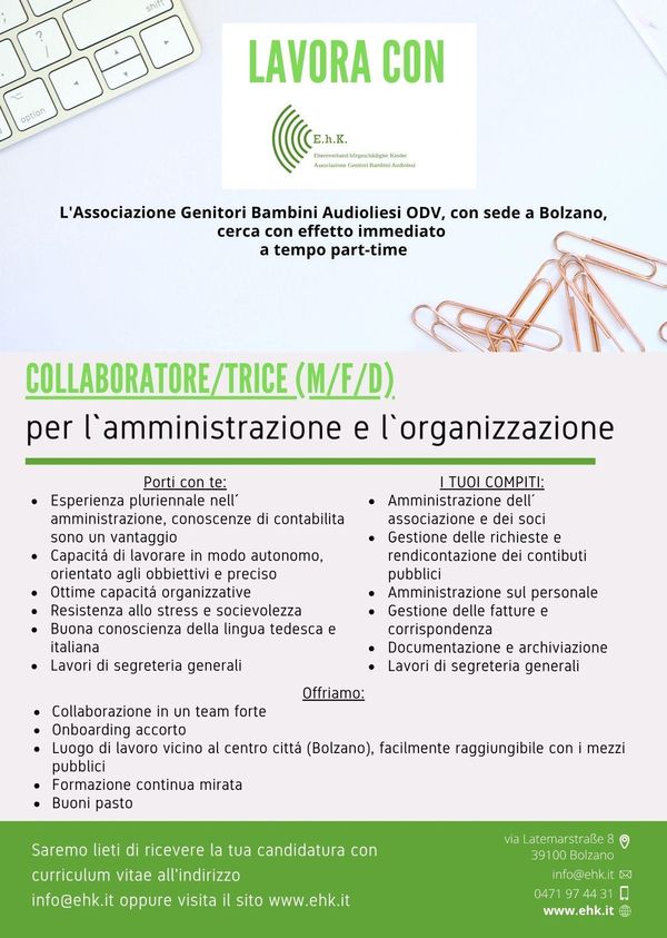 L‘ Associazione Genitori Bambini Audiolesi ODV con sede a Bolzano cerca part-time con effetto immediato un/a